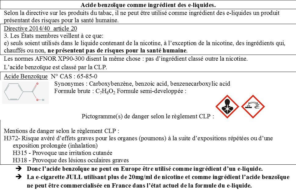 En effet dans l’énorme majorité des e-liquides vendus en France, la nicotine est de la nicotine-base (obtenue après avoir laissé agir de la soude sur des feuilles de tabac). Dans la Juul ce sont des sels de nicotine qui sont utilisés. Ces derniers sont obtenus en ajoutant un acide à la nicotine-base. De l’acide benzoïque en ce qui concerne la Juul.